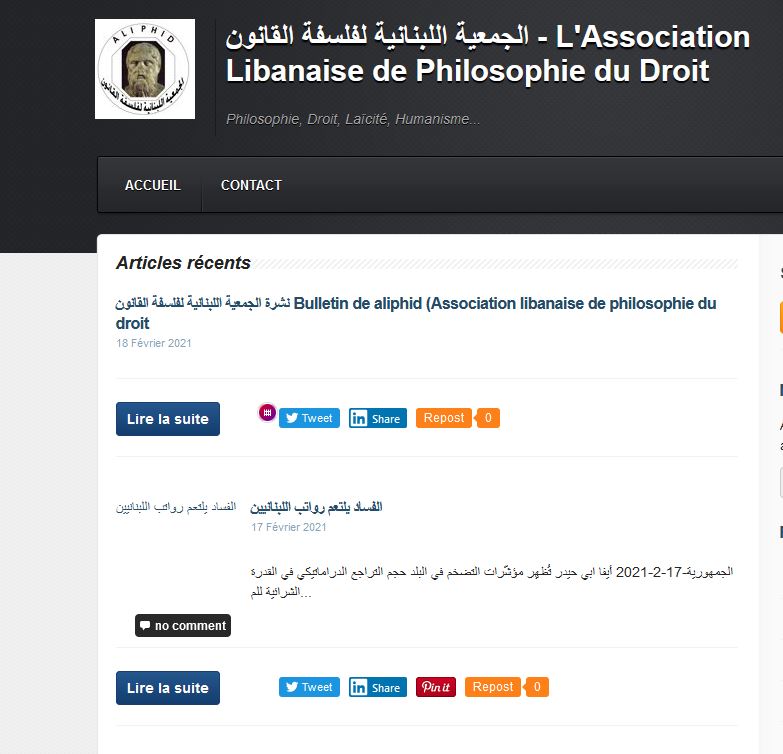 “تشكر الجمعية اللبنانية لفلسفة القانون ALIPHID نشطاء ومسؤولي الفدرالية الوطنية للفكر الحر (فرنسا) على مبلغ ال 800 يورو الذي قاموا بجمعه وإرساله لنا. وبالفعل، دون هذه الأموال، لما كنا تمكنا من إنشاء موقعنا (aliphid.over-blog.com)، ولا نشر العدد الأول من مجلتنا الالكترونية. نحن في مرحلة التعلم، ونحتاج لفترة لتدريب متطوعين، وقد اضطررنا في هذه الحقبة الصعبة اقتصاديا وصحياً (وباء الكورونا والإغلاق) الى اللجوء لتقنيين مقابل تعويض مالي. كما ساعدنا هذا المبلغ لدفع نفقات صغيرة شتى والاشتراك بالكابل wi-fi وإصلاح الكمبيوتر، الخ. لا يمكننا، في ظل الظروف الحالية، قبض الاشتراكات من الأعضاء بسبب تردي الوضع الاقتصادي بشكل مخيف إذ فقدت العملة الوطنية أكثر من 80% من قيمتها وبالكاد تستطيع الناس دفع ثمن لقمة العيش. لذلك لا زلنا بحاجة لدعم من الرفاق في المجتمع الدولي، أعضاء الجمعية الدولية للفكر الحر من أجل نشر أفكار العلمانية والمساواة والتي هي أهدافكم وأهدافنا“.