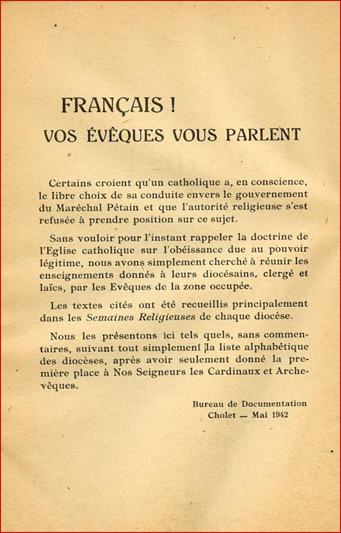 “Depuis quelque temps des catholiques sincères, qui veulent suivre fidèlement les enseignements de l’Église, nous demandent de préciser si, au milieu du désarroi général, une attitude définie s’impose en face du Pouvoir et singulièrement à l’égard du Gouvernement actuel de la France personnifié par le Maréchal Pétain.