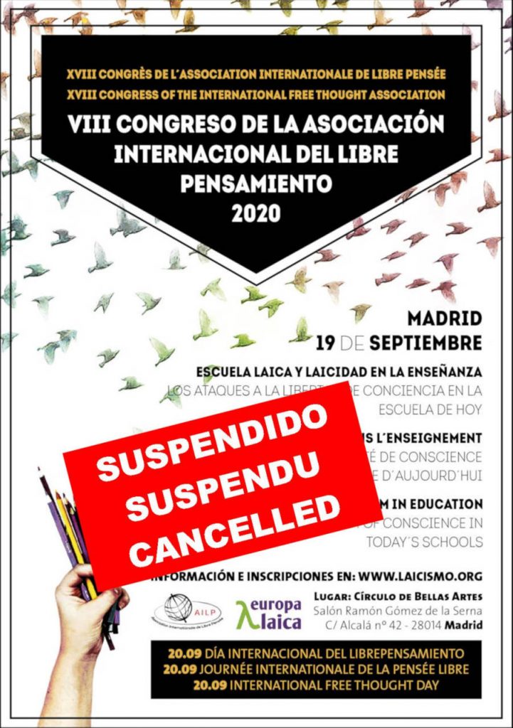 El pasado mes de febrero fue convocado oficialmente el VIII Congreso de la Asociación Internacional del Librepensamiento 2020:“Escuela Laica y laicidad en la Enseñanza – Los ataques a la libertad de conciencia en la escuela de hoy”, a celebrar en Madrid el día 19 de septiembre de 2020.